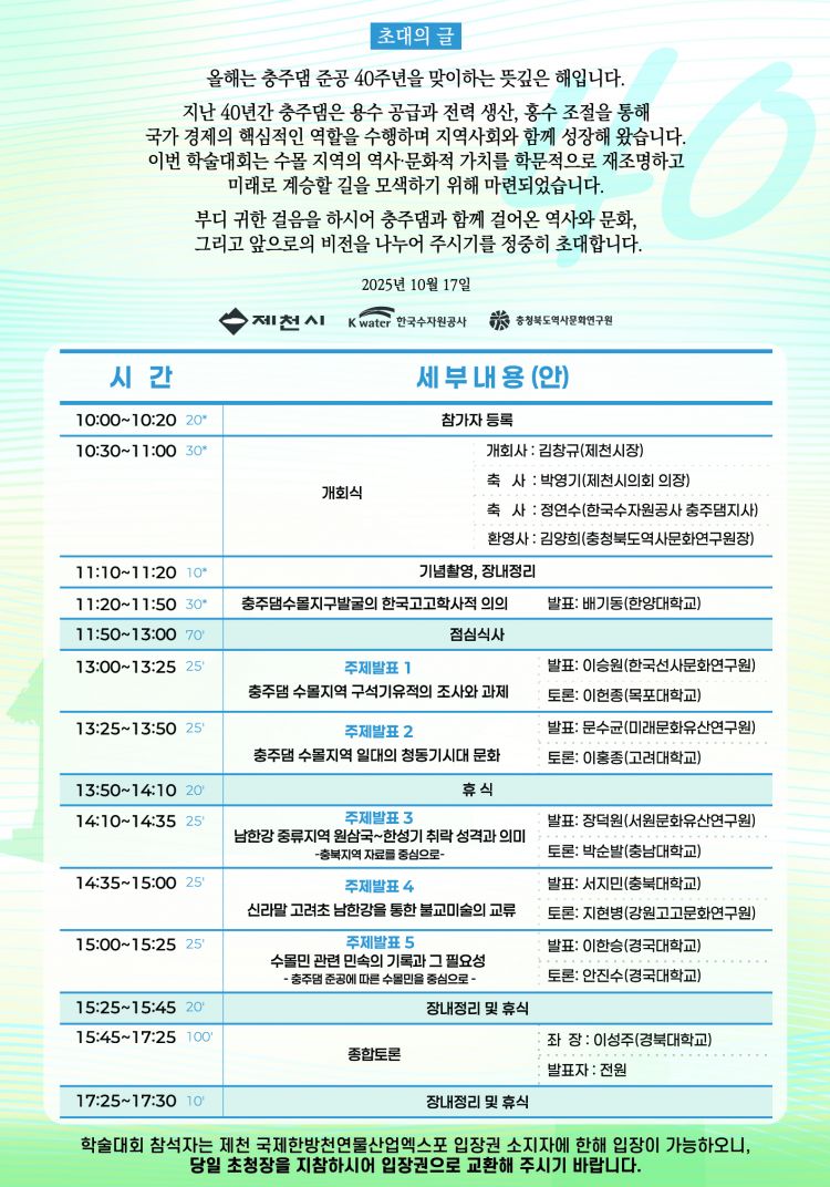 ¤· ÁÖÁ¦: ¹°±æ ¼ÓÀÇ ½Ã°£, ÃæÁÖ´ï ¹ß±¼ 40ÁÖ³âÀÇ ±â¾ï°ú ³»ÀÏ ¤· ÀϽÃ: 2025. 10. 17. (±Ý) 10:00-17:30 ¤· Àå¼Ò: Á¦ÃµÇѹ濢½ºÆ÷°ø¿ø Çѹæ»ý¸í°úÇаü 1Ãþ ´Ù¸ñÀû°´ç ¤· Á¦Ãµ½Ã, Çѱ¹¼öÀÚ¿ø°ø»ç, ÃæÃ»ºÏµµ¿ª»ç¹®È¿¬±¸¿ø ¤· "ÃæºÏÀÇ ¹®ÈÀ¯»êÀ̾߱â" ¿Â¶óÀÎÀº À¯Æ©ºê »ýÁß°è ¤· ¼¼ºÎÀÏÁ¤
