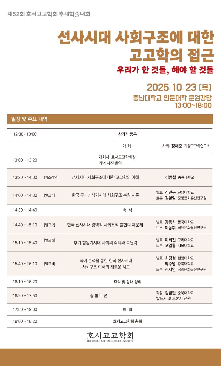 ¡Ý Çмú´ëȸ¸í : È£¼°í°íÇÐȸ Á¦52ȸ Ãß°èÇмú´ëȸ (¼±»ç½Ã´ë »çȸ±¸Á¶¿¡ ´ëÇÑ °í°íÇÐÀÇ Á¢±Ù: ¿ì¸®°¡ ÇÑ °Íµé, ÇØ¾ß ÇÒ °Íµé) ¡Ý ÀÏ ½Ã : 2025.10.23.(¸ñ) 13:00~18:00 ¡Ý Àå ¼Ò : Ãæ³²´ëÇб³ ´ë´öÄ·ÆÛ½º Àι®´ëÇÐ ¹®¿ø°´ç ¡Ý ¼¼ºÎÀÏÁ¤