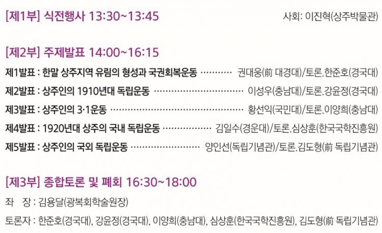 - ÁÖÁ¦ : ÇÔ²² ±â¾ïÇÏ´Â ±¤º¹ 80³â: »óÁÖÀÇ µ¶¸³¿îµ¿ À̾߱â - ÀϽà : 2025³â 12¿ù 18ÀÏ ¸ñ¿äÀÏ 13:30~18:00 - Àå¼Ò : »óÁÖ¹Ú¹°°ü ¼¼¹Ì³ªµ¿ - ÁÖÃÖ : »óÁֽà - ÁÖ°ü : »óÁÖ¹Ú¹°°ü, Çѱ¹±ÙÇö´ë»çÇÐȸ - ¼¼ºÎÀÏÁ¤