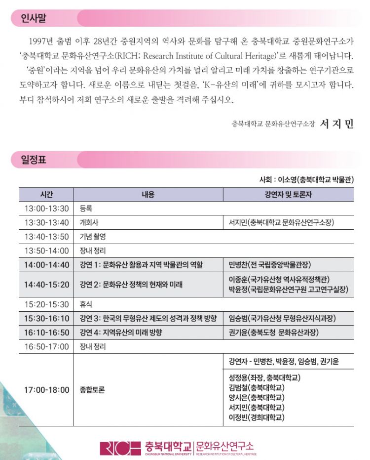| Á¦¸ñ ÃæºÏ´ëÇб³ ¹®ÈÀ¯»ê¿¬±¸¼Ò(ÏÁ Áß¿ø¹®È¿¬±¸¼Ò) Ãâ¹ü ±â³ä °¿¬È¸ °³ÃÖ |
