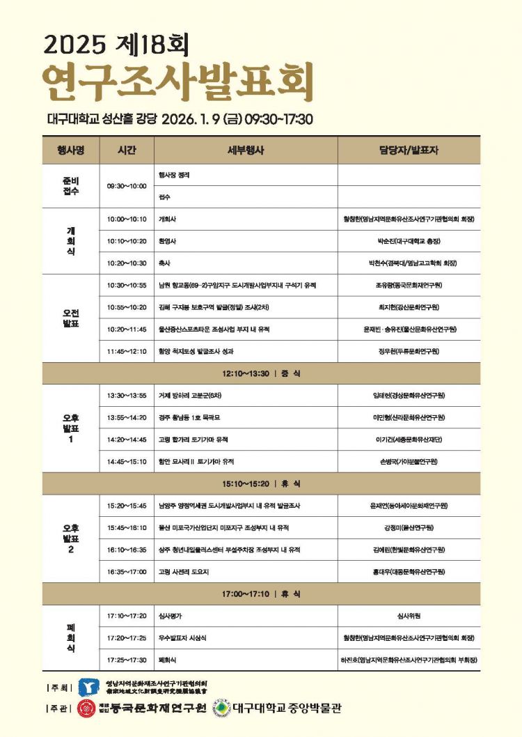 | Á¦¸ñ ¿µ³²Áö¿ª¹®ÈÀ¯»êÁ¶»ç¿¬±¸±â°üÇùÀÇȸ 2025 Á¦18ȸ ¿¬±¸Á¶»ç¹ßǥȸ °³ÃÖ |